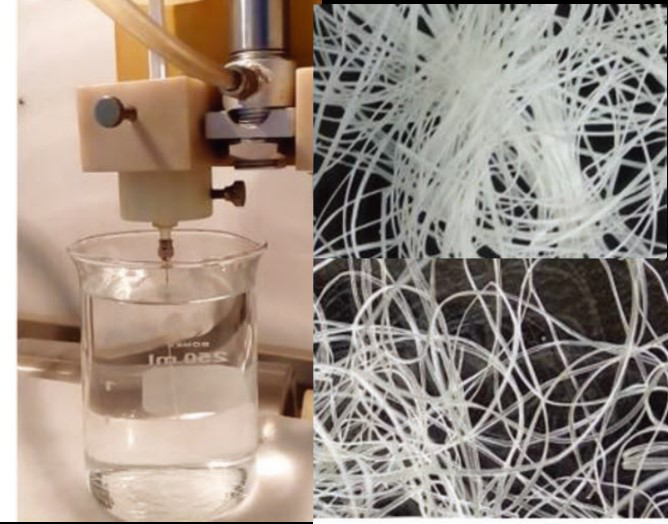 清華大學(xué)王訓(xùn)團(tuán)隊(duì)受到櫻桃樹皮中螺旋狀纖維素的啟發(fā),將這種特性應(yīng)用于柔性納米線的制造中。將長度為數(shù)百納米,直徑小于1納米的GdOOH納米線紡絲原液通過濕紡來制造納米線纖維。在注射應(yīng)力、剪切力和溶劑交換的影響下,通過控制紡絲原液和凝固浴,流動速率等可以得到有序的彈簧狀納米線結(jié)構(gòu),從而獲得高度可拉伸的柔性納米線纖維。該納米線纖維斷裂伸長率通常可以達(dá)到40%~50%,最高伸長率可達(dá)86%,并且該納米線纖維在纏繞、彎曲和扭曲的情況下都不會產(chǎn)生任何裂縫。通過拉伸試驗(yàn)中的結(jié)構(gòu)轉(zhuǎn)變和同步加速器小角X射線散射(SAXS)研究得出,纖維中整齊的彈簧狀納米線組裝超晶格是產(chǎn)生該特性的主要原因,并且通過添加無機(jī)納米顆粒,能夠使該納米線纖維進(jìn)一步增強(qiáng)增韌。