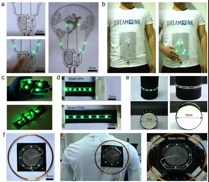 研究人員展示了一系列基于該項技術(shù)制備的液態(tài)金屬智能服裝。這種液態(tài)金屬智能服裝的制備方法操作簡單,不需要復(fù)雜昂貴的設(shè)備,與剛性電子器件結(jié)合可以制造出多功能、大面積的可穿戴柔性電子設(shè)備,為開發(fā)個性化定制智能服裝提供了新的解決途徑。