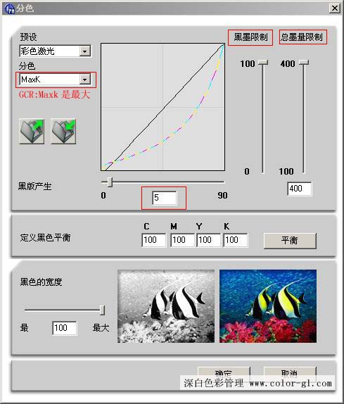 總墨量限制:400%;黑版墨量限制100%;黑板生成GCR最大;黑版起始點(diǎn)5%-10%。