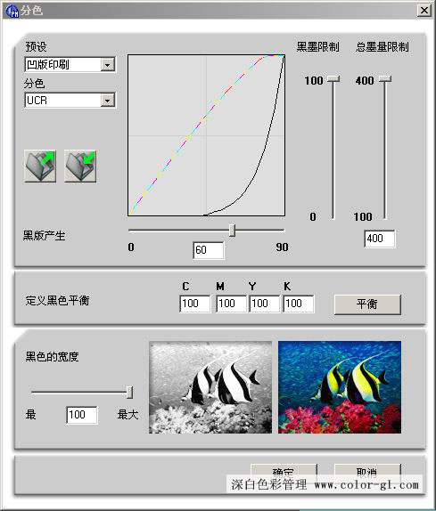 總墨量限制:320%;黑版墨量限制100%;黑板生成UCR重度;黑版起始點(diǎn)60%。
