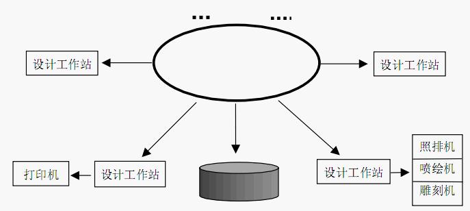 本系統(tǒng)采用以 Windows NT、Windows 95 為核心的對(duì)等網(wǎng)絡(luò)工作環(huán)境。各圖案設(shè)計(jì)工作站可以共享資源,支持遠(yuǎn)程數(shù)據(jù)傳輸與共享。其結(jié)構(gòu)為: