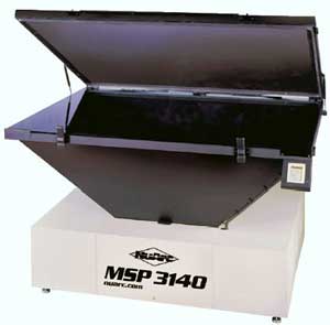 在我這次走訪之前,公司的生產(chǎn)部門使用單個曝光設(shè)備,平均每日生產(chǎn)50塊絲網(wǎng)版。而按我的建議改革實施之后,公司領(lǐng)導(dǎo)增購了一臺曝光設(shè)備,能在同一時間曝光尺寸在23×31” OD的絲網(wǎng)版。這臺曝光設(shè)備擁有兩個金屬鹵化物燈,其中一個就直接位于每一塊絲網(wǎng)版的下方。該設(shè)備由真空包裝殼體支撐,并配備有一個光能累積器。曝光射線可分割范圍從105秒到16秒不等,但如今已是同時在生產(chǎn)兩塊絲網(wǎng)版,而不僅僅是單獨一塊了。
