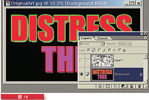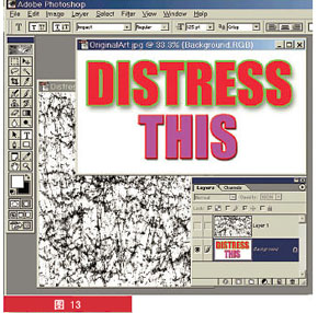 圖像分辨率直接決定了仿舊(線)效果與尺度,因此仍然建議保持分辨率在150至200 dpi范圍內(nèi)。如果是多色圖像,要對整幅圖在分色前先行仿舊處理。其后一步是打開源圖像,顯示圖層面板(窗口/顯示圖層)。然后新建圖層,打開所需應(yīng)用的圖層文件將其復(fù)制到該圖層之中,可直接點擊圖層文件的背景圖層并拖動至源圖像上面。如有需要可使用拖動工具改變仿舊效果區(qū)域的定位,或使用選框工具改變其區(qū)域的大。▓D13)。