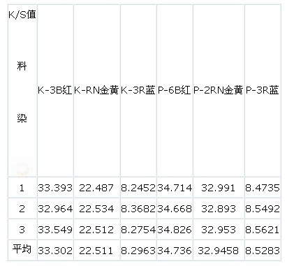選用K型活性染料三只:K-3B紅、 K-RN金黃、 K-3R 藍(lán), P型活性染料三只: P-6B 紅、P-2RN 金黃、P-3R藍(lán)。在常規(guī)工藝下,染料濃度3%,分別在粘膠織物上刮色塊樣,烘干并汽蒸,后處理完后,在電腦測(cè)色配色儀上分別測(cè)其粘膠印花織物表面K/S值,其測(cè)試數(shù)據(jù)見表1。