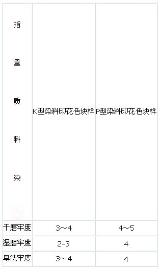使用新型P活性染料對(duì)粘膠織物進(jìn)行印花,其印制出來的產(chǎn)品的各項(xiàng)性能都優(yōu)于傳統(tǒng)的K型活性染料對(duì)粘膠織物的印花.傳統(tǒng)的K型活性染料對(duì)粘膠織物的深色印花,往往是使用的大量的染料助劑來提高起得色量,這樣不僅增加的成本,還需要用大量的水去水洗,造成的水資源的極大浪費(fèi),并且在水洗時(shí)易造成搭色,而新型P活性染料在這方面較K型活性染料有的較大改進(jìn).