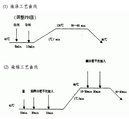 滌棉針織物分散/活性印花大多需要染底,然后在底色上印一些花朵、動(dòng)物、文字等圖案。采用高溫溢流染色機(jī)MK一88-4T。為了保證質(zhì)量,便于工藝控制,采用二浴法染色。
