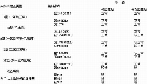 4.2 使用活性強(qiáng)的多(兩個(gè)及以上)活性基活性染料印花時(shí),由于少部分糊料參與反應(yīng)而不能洗除,會(huì)不同程度地使粘膠織物手感發(fā)硬;摻雜多的海藻酸鈉糊會(huì)使手感發(fā)硬的現(xiàn)象更加明顯。(使用劣質(zhì)的海藻酸鈉糊還會(huì)使活性染料印花得色淺、色澤泛紅且萎暗、印透性差,甚至色花)