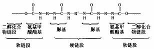 氨綸是一種高彈性合成纖維,主要化學(xué)組成是聚氨基甲酸酯,它具有由軟鏈段和硬鏈段組成的嵌段共聚物形成的網(wǎng)絡(luò)結(jié)構(gòu),即具有“區(qū)段”網(wǎng)絡(luò)結(jié)構(gòu)。其主要鏈段組成如下: