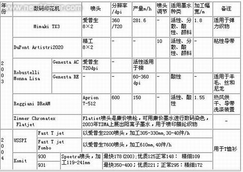 除了上述代表性數(shù)碼印花機(jī)外,尚有Colorspan Display Maker Fabrijet Ⅻ等,有人對(duì)近期市場(chǎng)出現(xiàn)的一些織物數(shù)碼印花機(jī)的性能價(jià)格比作了分析。