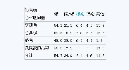 從表一可見棉染色物發(fā)生的變褪色和落色等色牢度問題最嚴(yán)重,特別是使用活性染料染色的棉染色物無論在洗滌時(shí),儲(chǔ)存時(shí)或穿著時(shí)都會(huì)發(fā)生變褪色和落色問題。分析產(chǎn)生這些變褪色和落色等色牢度問題的原因,選好和用好染料,提高各種染色物的質(zhì)量,對增強(qiáng)紡織品的時(shí)常競爭力和應(yīng)對歐美等過不斷設(shè)置的各種技術(shù)壁壘和貿(mào)易壁壘具有積極作用。