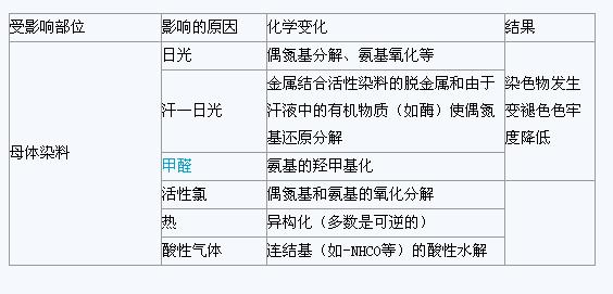 其中母體染料對活性染料的顏色,溶介度,固著率以及光牢度、汗一日光牢度、氯牢度和受甲醛、熱、酸性氣體等作用發(fā)生的變褪色等起著決定的作用;連結(jié)基把母體染料與活性基部分結(jié)合成為一個(gè)整體,起著平衡兩個(gè)組成部分使其產(chǎn)生優(yōu)異性能的作用,顯然它也會(huì)對因受化學(xué)物質(zhì)作用發(fā)生的變褪色問題起作用;活性基部分中的活性基和親電子中心一起影響著活性染料與纖維間形成共價(jià)結(jié)合的能力以及活性染料的耐氧化劑性、耐酸性氣體性和耐熱性等,活性基部分中的第二取代基連接在親電子中心上,雖然不是活性基,但它也會(huì)影響活性基的反應(yīng)能力,甚至活性染料的某些性能,也就是說活性基部分主要是活性基會(huì)對受氧化劑、酸性氣體和熱作用發(fā)生的染色物落色問題起重要作用。由此可見,活性染料染色物的變褪色和落色等色牢度問題的主要原因可歸結(jié)如表二所示:表二 活性染料染色物發(fā)生色牢度問題的原因