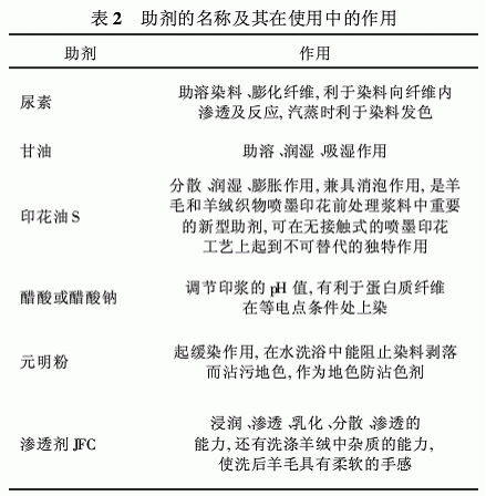 在調(diào)配好滲透性、抱合性的基礎(chǔ)上,針對噴墨印花所使用的活性染料(活性染料中的青、品紅、黃、黑4個(gè)基本色中的M、Y、K的分子較小,但C的分子結(jié)構(gòu)相對大些),要使它們在同等條件下均勻發(fā)色[6—7],應(yīng)在酸性浴的條件下增加漿料的吸濕性、溶解性、防滲化性。同時(shí)考慮羊絨纖維表面的絨毛現(xiàn)象,必須添加助劑,且對其用量作適當(dāng)分配。需要添加的助劑如表2所示。