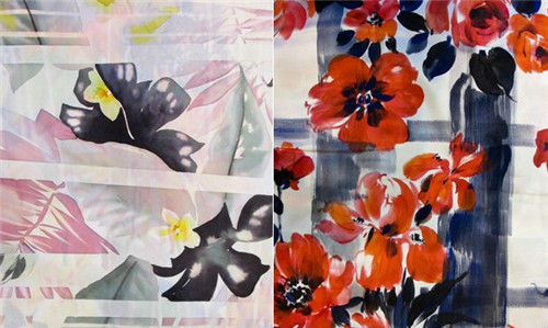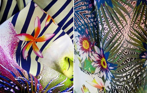 熱帶花朵混合重新著色的豹紋圖案,打造出叢林景象圖案的外觀,成為本季兩大潮流元素趨勢。動物紋理充滿整個背景色;精細設(shè)計的簇擁定點熱帶花朵;黑色及白色傾瀉動物圖案漸漸退變?yōu)榇負砘ǘ鋱D案,打造出抓人眼球的邊花外觀。
